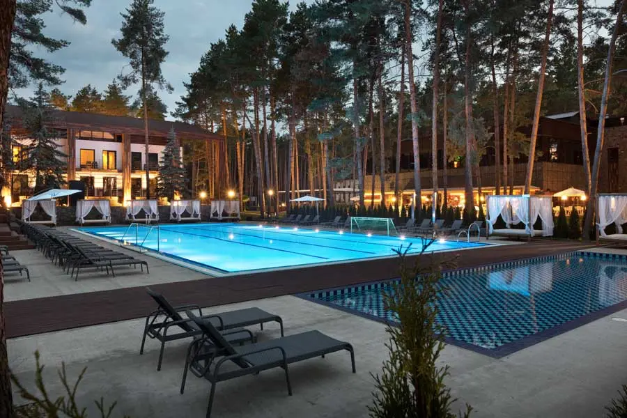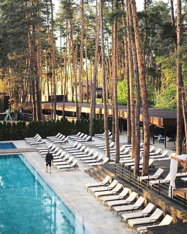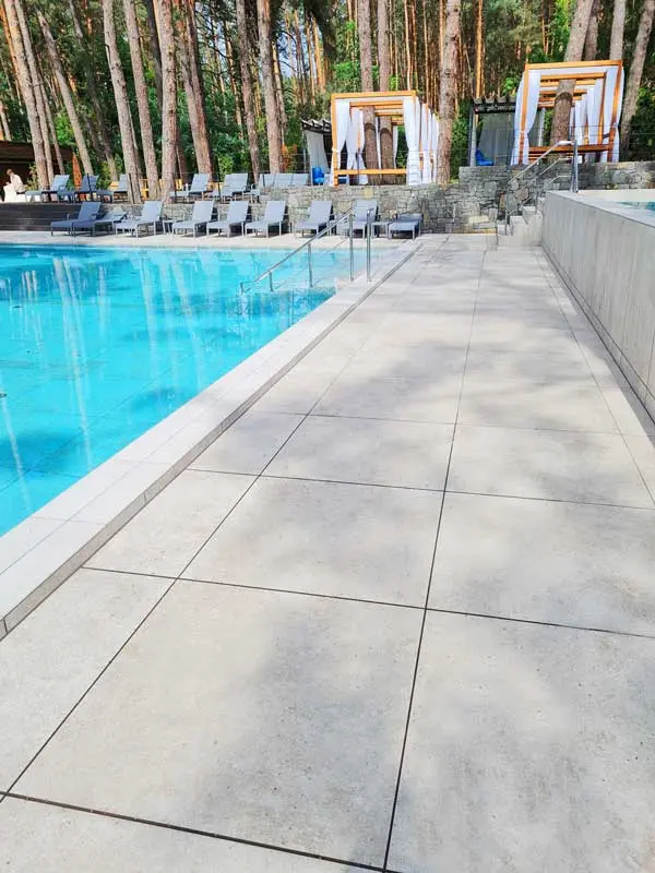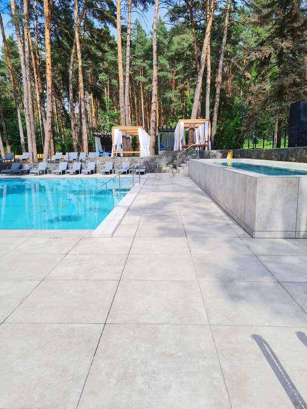 Hotel with an outdoor pool has been completed, nestled in a pine forest. The result is spectacular. The project required a durable, non-slip flooring that was resistant to weather, acids, and mold. For this reason , 2 cm thick L'ALTRA PIETRA